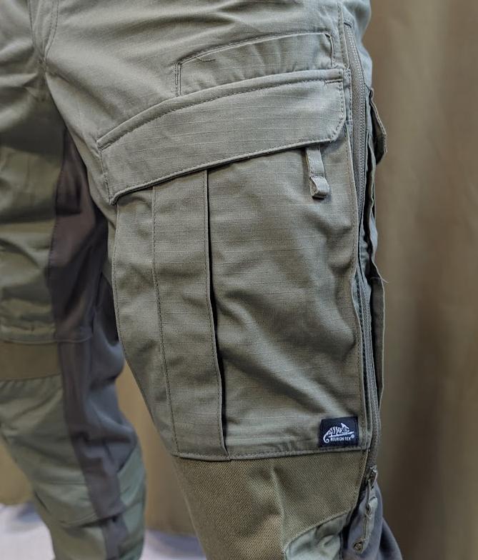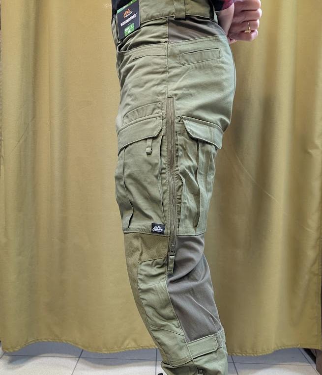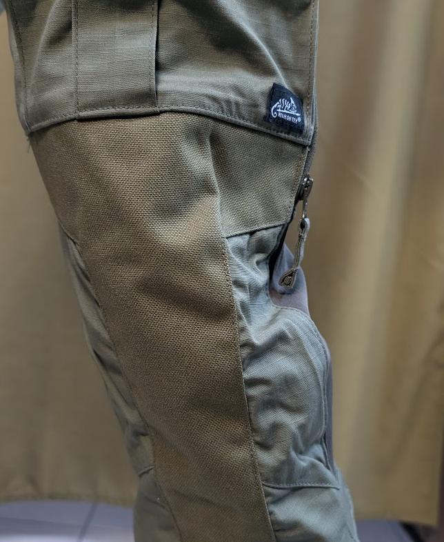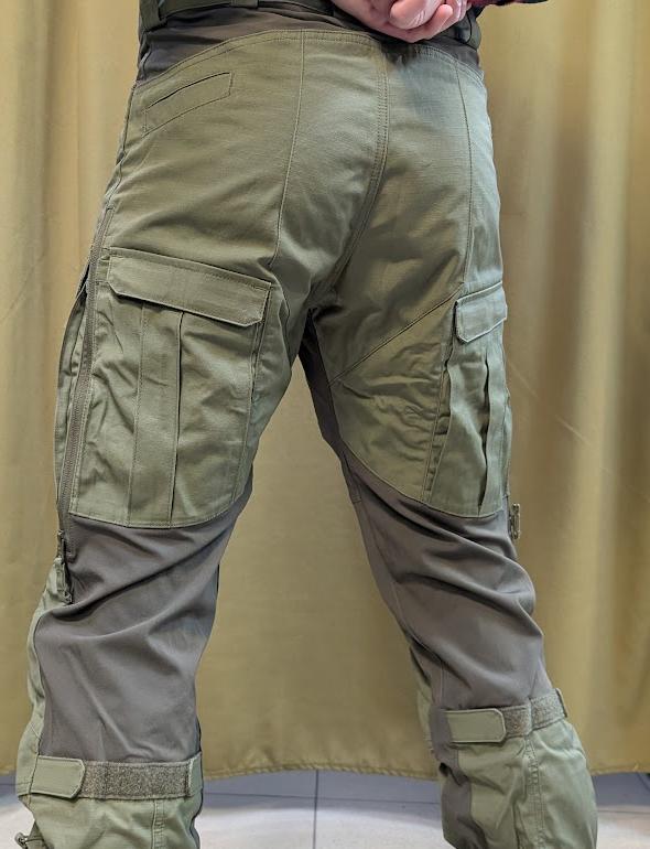 В ключевых зонах (талия, паховая область и задняя часть колен) используются вставки из материала Versastrech. Он быстро сохнет и обладает высокой воздухопроницаемостью. Область колен усилена тканью Cordura 500D с прорезями для защитных вставок. Благодаря дополнительным шнуркам, расположенным под коленом и внизу штанины, брюки легко регулируются по ноге.