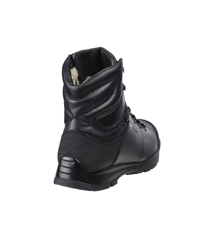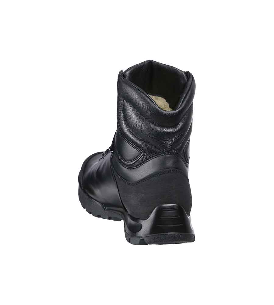Изюминкой данной обуви является подкладка из натуральной шерсти овец Меринос. До сих пор не создан аналог овечьей шерсти, способный в точности повторить ее уникальные терморегулирующие свойства. Именно поэтому изделия из Мериноса комфортны как в жару, так и хорошо защищают от холода. Шерсть овец Мериноса является прекрасным терморегулятором, так как поддерживает постоянную температуру тела без перегрева. Данную шерсть в сравнении с синтетическими утеплителями отличает высокая гигроскопичность - за счет капиллярного эффекта она поглощает до 33% влаги от собственного веса и при этом поверхность остается сухой. Стоит отметить также лечебные свойства - изделия из шерсти мериноса производят микро массаж улучшающий кровообращение, не раздражают кожу. Ланолин, который содержится в шерсти, благотворно влияет на организм человека при остеохондрозе, ортопедических, ревматических заболеваниях, бронхиальных недугах. Удобная шнуровка обеспечивает плотную и комфортную затяжку обуви благодаря использованию литьевой итальянской фурнитуры высокого качества. Рекомендовано использовать в качестве зимнего городского тактического ботинка для сотрудников подразделений патрульно-постовой службы, охраны, МЧС и т.д. Комфорт до - 20 градусов Цельсия.