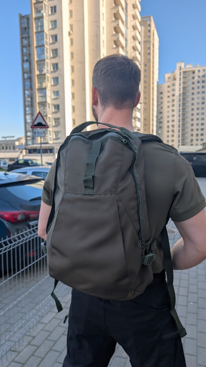 Снаружи, не передней стороне имеются 2 влагозащищенных кармана приличного объема, оснащенные качественными молниями. А так же, пришита стропа, для дополнительного крепления вещей.