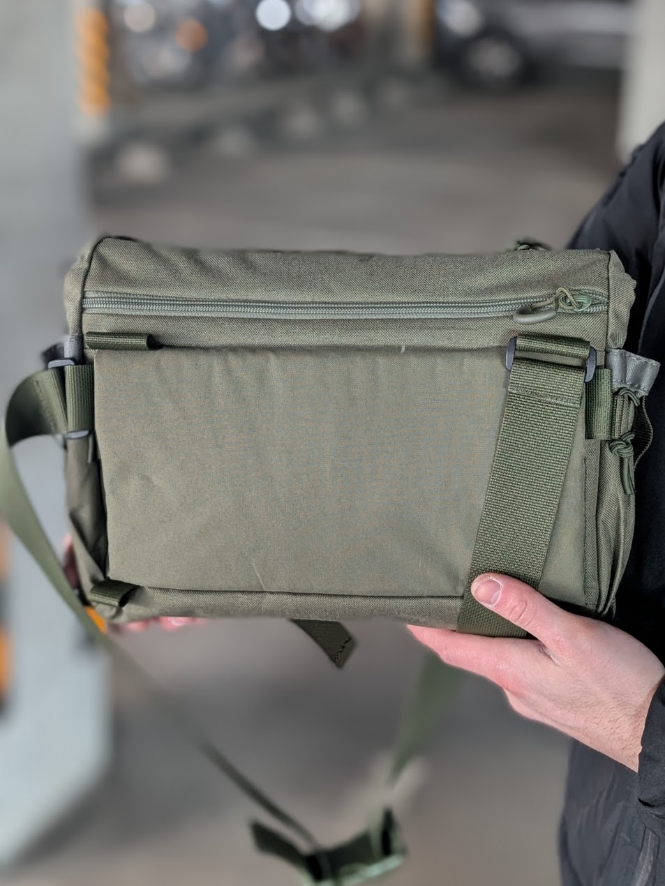 Имеет 2 кармана на молнии, внутри 2 больших кармана с разделениями