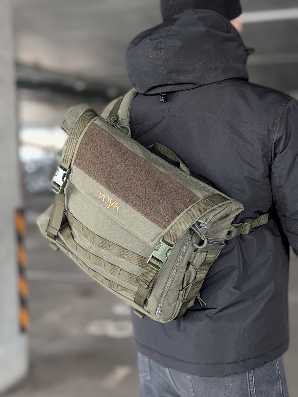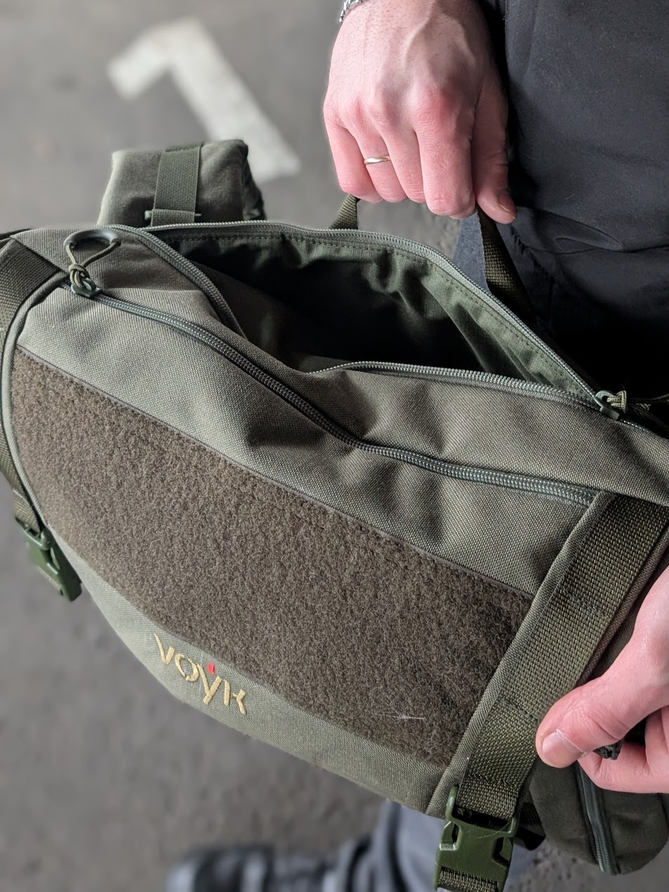 Основное отделение с тремя плоскими карманами внутри. Объемный карман на передней стенке сумки. Также есть два плоских боковых кармана. Имеет съемный ремень и дополнительный ремешок для фиксации за спиной. Можно носить как на поясе, так и через плечо.